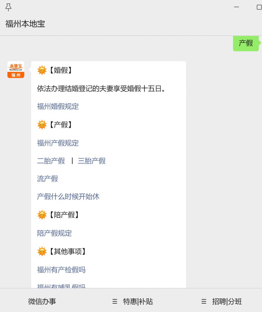 温馨提示:微信搜索公众号福州本地宝,关注后在对话框回复【产假】可获取福州婚假、产假、陪产假、流产假天数、产假工资发放规定、生育津贴等信息。